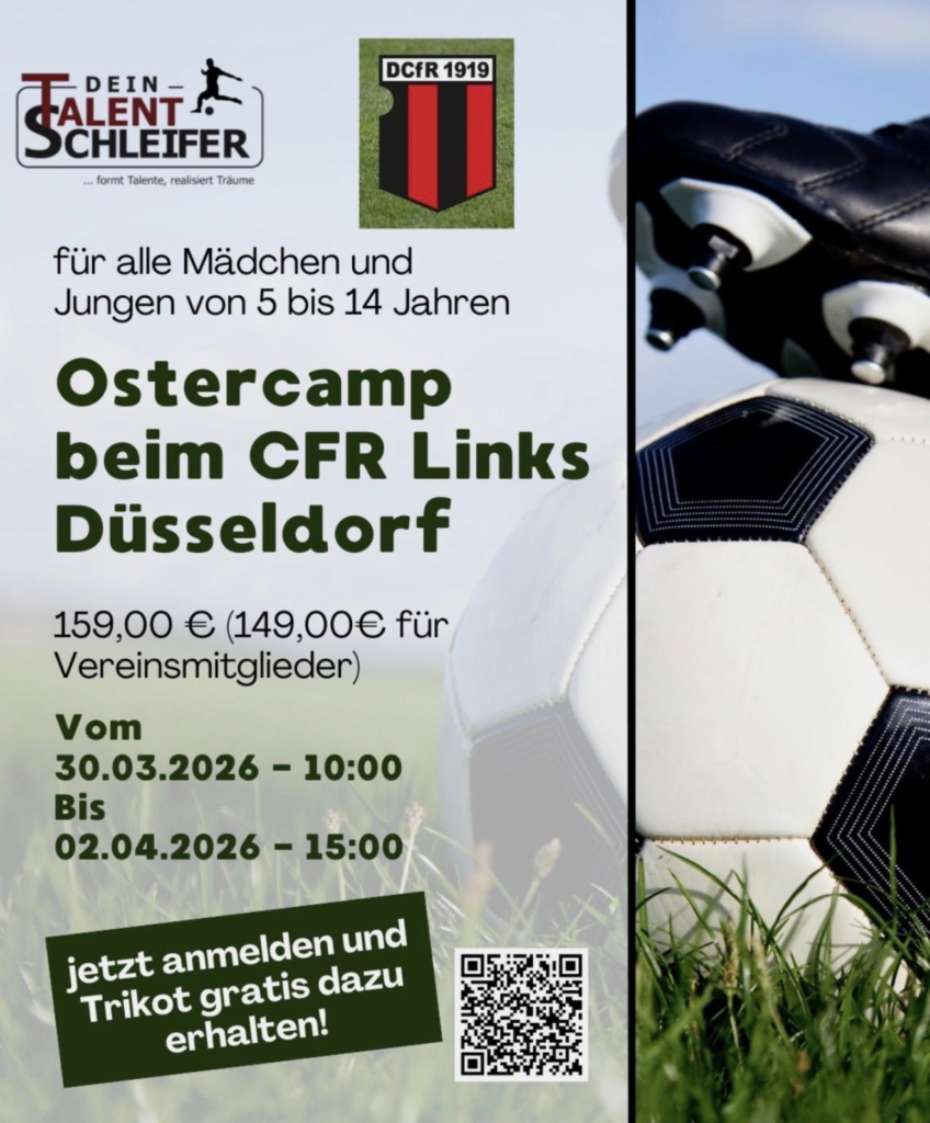 Auch in diesem Jahr findet auf unserer Anlage an der Pariser Straße das Ostercamp statt, diesmal aber von Dein Talent Schleifer. Marcus John, ein sehr erfahrener Trainer und ehemaliger Fußballspieler (und Bruder von Virpi John, einer ehemaligen Spitzenspielerin des CfR) sorgt für lehrreiche Stunden und viel Spaß in den Ferien.